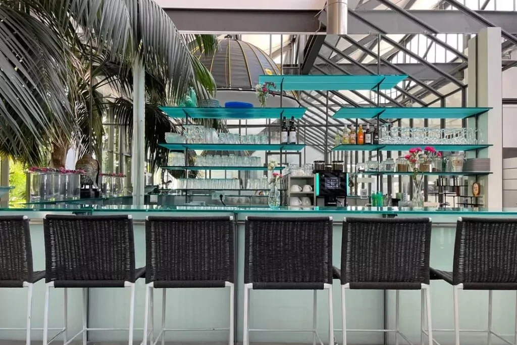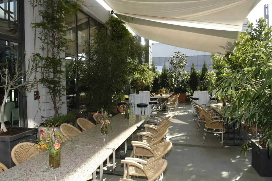 Das Studio hat einen grauen Fußboden und hat eine Gesamtfläche von 200 Quadratmetern. Ein kleiner abgetrennter Bereich kann perfekt als Backoffice für das Catering genutzt werden.
