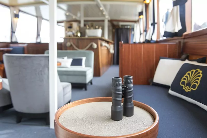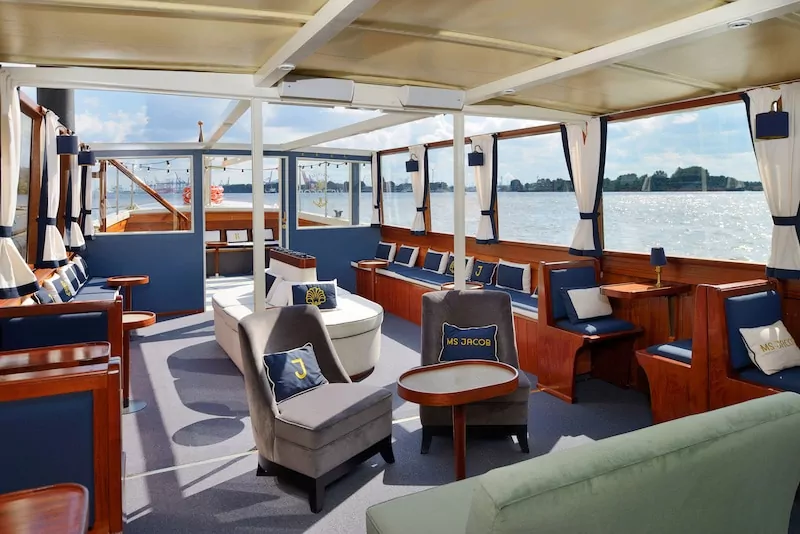 Auf 22m verfügt die MS Jacob über 15 Plätze auf dem Deck. Im Innenraum erwartet Sie neben einer Bar außerdem ein maritim gestalteter Lounge-Bereich, der dank viele Kissen und Poufs für stilvolle Gemütlichkeit sorgt und zum Verweilen für bis zu 40 Personen einlädt. Machen Sie es sich gemütlich und genießen Sie die Fahrt.